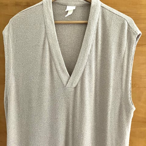 Vaalea hihaton neuleliivi koko XL. Ruskeat hieman kimaltavat koristeneuleet.