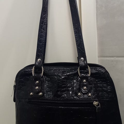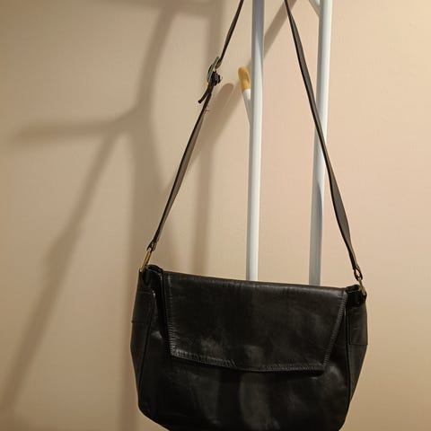 Crossbody kaksipuolinen laukku. Sisällä taskuja.