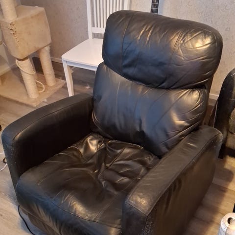 Annetaan pieni pyörivä, tukeva retro nojatuoli. Muotoilultaan Kilta-tuolien kaltainen (rungon alkuperästä ei tietoa). Metallinen jalka. Istuinkorkeus matala. Uudelleen verhoiltu n. 20 vuotta sitten, verhoilu kauttaaltaan siisti, mutta helppo verhoilla myös uudelleen haluamansalaiseksi.