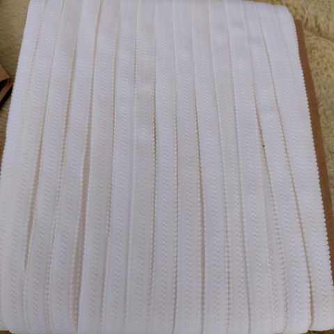 Napakka ja laadukas vyötärökuminauha. Korkeus 34mm. Nauha on valkoista ja siinä on harmaa ja musta raita. Tätä löytyy 2 pitkää pätkää: 4.70m ja 5.80m eli yhteensä 10.5 metriä. Saa ostaa sellainen pätkän kun on tarvetta , hinta 2.70€/1 metri. Pk alkaen 2.75e