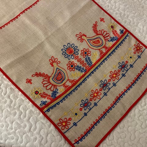 Myydään uusi, käsin kudottu pellava kaitaliina 180 cm x 55 cm. Marjapuuron värinen.