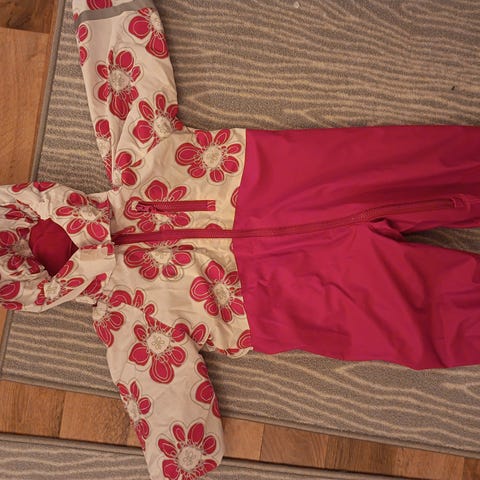 Ulkoilupuku Koko 86 Ciraf. Värit pysyneet hyvinä ja kirkkaina.Hieman vihertävän keltainen. Takki tosi siisti, housut hieman kuluneet polvista ja pepusta. Housuissa hyvin haaleita tahroja. Nämä kulumiset eivät näy juuri lainkaan.