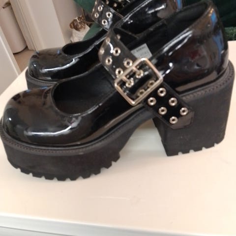 Mustat kiiltonahkakengät, pieni korko, kengän pituus 26cm, hinta 10e