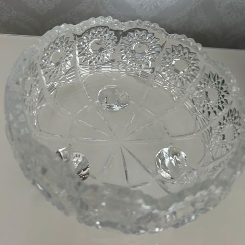 Kristallihiomo M. Okkolin kristallikulho. Halkaisija n. 32 cm. Reunassa pari pientä kolhua, näkyvät toisessa kuvassa. Nouto Koivistonkylästä.