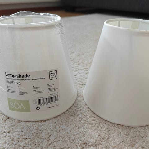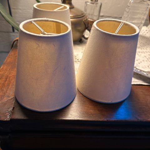 Myydään kaksi pientä käytettyä lampun varjostinta. Mitat: korkeus 10,3cm, yläreunan halkaisija 7,9cm sekä alareunan halk.10,9cm. Väri luonnonvaalea sekä ruskean sävyt.
