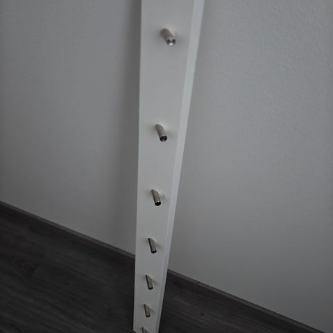 Umbran seinänaulakko, vaatenaulakko, jonka koukkuja [ylä ja alaosaa) voi liikuttaa, jolloin vaatekoukkuja on kolme tai kuusi, ja naulakon ilme muuttuu. Yläosa saarnea, alaosa mustaksi maalattu. Pituus noin 54cm, korkeus 12cm.