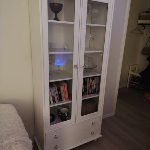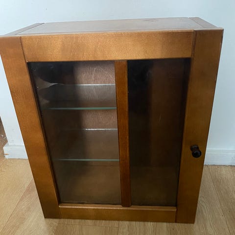 Petsilakattu, yksi hylly keskellä ja koristeveistos päällä.( Lasien hinta jo 40e )