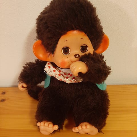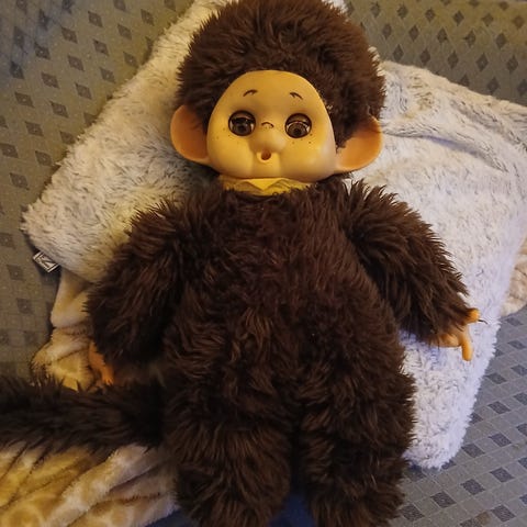 Vanha Monchhichi-apina, toinen käsi hieman irrallaan (näkyy toisessa kuvassa) mutta käden voi halutessaan korjata, muuten hyväkuntoinen, pituus hieman alle 20 cm, mukana kuvassa näkyvät vaatteet, hinta 12 euroa mutta saa myös tarjota
