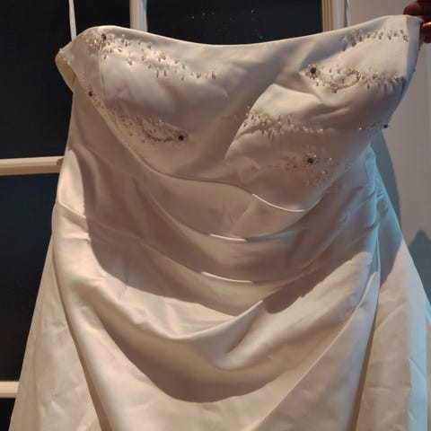 Säilytetty pukupussissa vaatehuoneessa henkarissa kokopitkänä, eli ei ole helmaankaan tullut taitoksia. Itse käytin L/XL vaatekokoa häiden aikaan. Sovittamaan pääsee ennen ostopäätöstä.