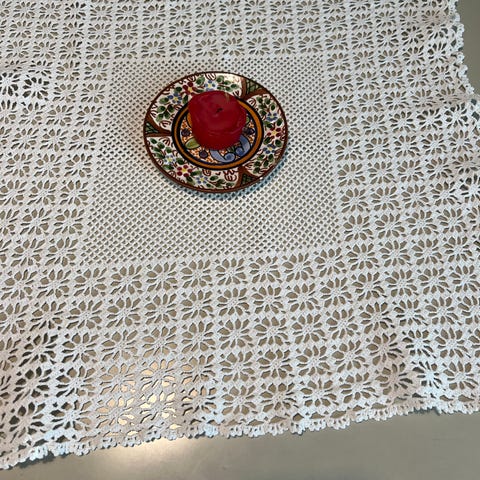 Vanha iso pitsityynyliina 60x60cm upealla pitsillä