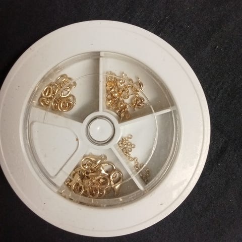 Askartelupaketti lasten rannekoruille. Maalit oli kuivuneet, mutta muita osia jäljellä. Liimastakaan en ole varma.