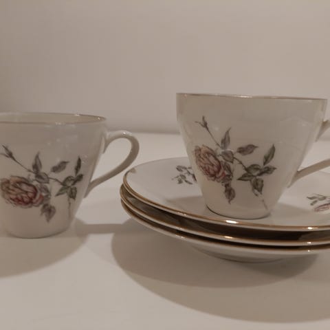 2 kuppia ja 2 aluslautasta. Toisessa kupissa hiushalkeama, toisessa lautasessa alapuolella lasituksessa vähän lohkeamaa (ei tunnu sormella) ja toisesta aluslautasesta puuttuu pikkuruinen pala. Virheet näkyvät kuvissa.