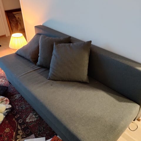 Hyvä kunto. Kaikki tyynyt tummanharmaita. Kuvassa meidän sisustuspäälliset.
