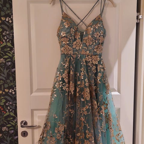 Myydään kermanvärinen vanhojen tanssimekko. Yläosassa ja helmassa strasseja sekä helmiä. Mekko on käytetty pesulassa käytön jälkeen.