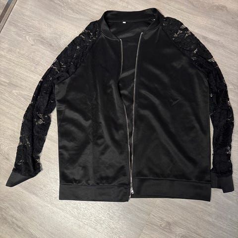 Naisten musta pitsijakku koossa M. Lyhythihainen, avoin malli ilman napitusta. Jakussa on läpikuultava, kuviollinen pitsikangas, joka sopii esimerkiksi kevyeksi kerrokseksi mekon tai topin päälle arki- ja juhlakäyttöön.