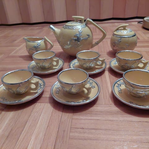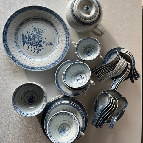 Aito kiinalainen astiasto. 1 tarjoilukulho, 2 soikeaa tarjoilulautasta, 6 ruokalautasta, 6 pientä kulhoa ja 6 lusikkaa. Vain nouto.