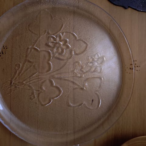 Kaija Aarikan suunnittelemat lasiset Puolukka-lautanen halk. 25 cm ja Heiniä kainalossa-maljakko kork. 17 cm ja halk. 10 cm. 80-90 luku.