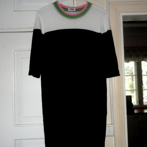 Ohut vuoriton Sonja Rykielin jakku. Takapituus 61cm, kainalo-kainalo 45cm, hiha alta 45cm. Toisessa taskussa koristeena rusetti. Tyköistuva, ei jousta, valitettavasti itsellä ei mene kunnolla kiinni....Lapussa lukee, että ei vesipesua, mutta uskon, että käsin pestävissä.. Postitus 9,00 eur