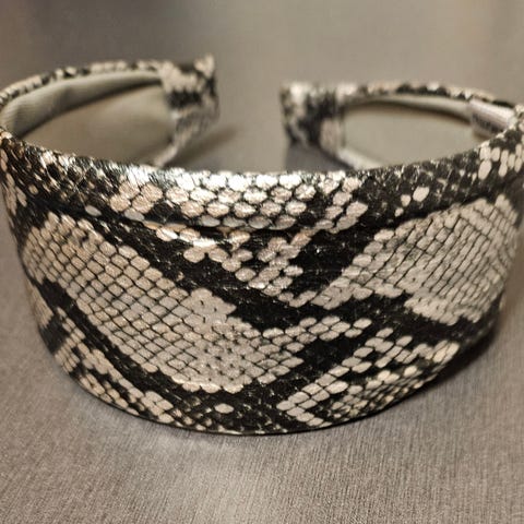Ruskea krokokuvioinen hiuspanta, mayeriaali aitoa nahkaa. Leveys leveimmästä kohtaa 3,5 cm. Siistikuntoinen, ei ole ollut käytössä.