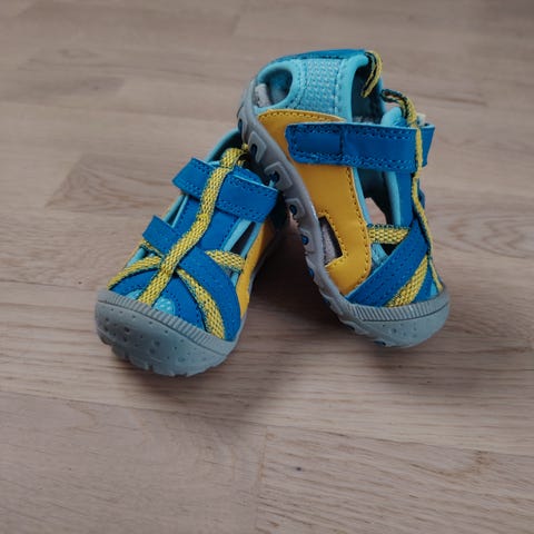 Yhdellä lapsella käytössä olleet sandaalit. Pientä kulumaa on, kuten käytössä olleissa kengissä luonnollisestikin, mutta yleisilmeeltään hyväkuntoiset ja siistit.