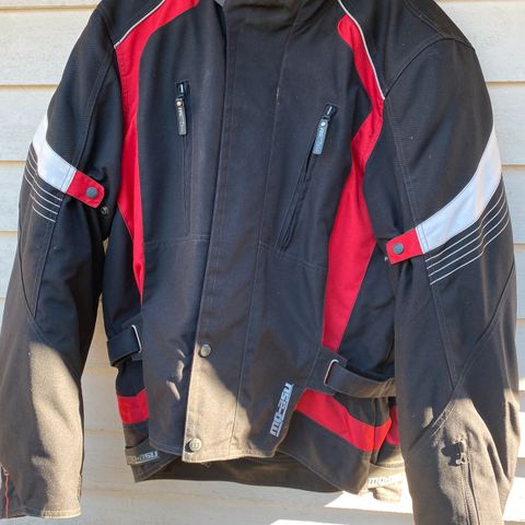 Siinäpä mp asun klassinen tekstiilitakki ja -housut lämpövuorilla ja riittävällä määrällä taskuja. Ollut käytössä pitkään, mutta pidetty huolta. Viimevuodet lähinnä alkukevään ja loppusyksyn ajoihin käytetty. Suojatkin kunnossa, vetoketjut toimii ja nepparit myös. Ei kaaduttu tai könytty muutenkaan.