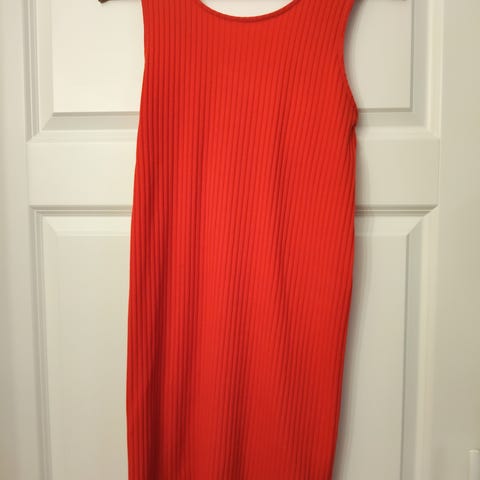 Monkin punainen mekko, koko xs. Ohutta, laskeutuvaa kangasta, pinnassa kuviointi. Selkäpuolella v-aukko ja nyörikiinnitys. Vähän käytetty, hyvä kunto.