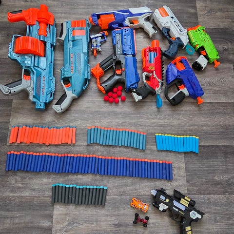 12 erikokoista Nerf-pyssyä (+1 muu), 5 lisäosaa, maalitaulu + "tölkkejä" ja ammuksia.