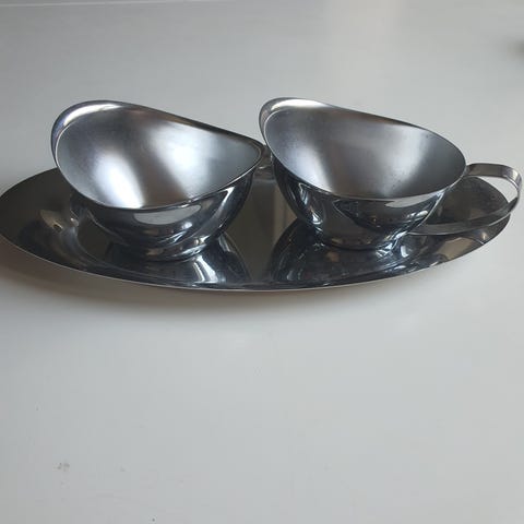 Ruotsalaisen Sycon (1945-61) keraamiset kermakko ja sokerikko. Kermakon korkeus 5 cm, sokerikon korkeus 5 cm ja suuaukon halkaisija 9,5 cm. Ruskea ulkoa ja valkoinen sisältä. Sokerikon pohjassa olevat tummat täplät ovat peräisin valmistusmetodista.