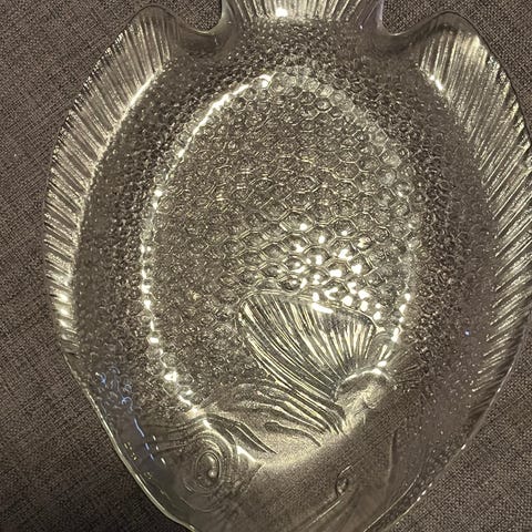 Lasinen tarjoilualusta, jossa metalliset koritepäädyt ja metalliset jalat. Pituus 62 cm, leveys 21 cm. Puhdas, ehjä ja käyttämätön. Lähetyskulu ostajalle.