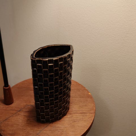 Harvinainen vanha Arabia Harlekiini posliinimaljakko. Vihreäruskea. Mitat: 8 cm syvä, 12 cm leveä, 19 cm korkea. Ehjä mutta teksti pohjassa ei näkyy enää. Keräilyesine. Voi lähettää.