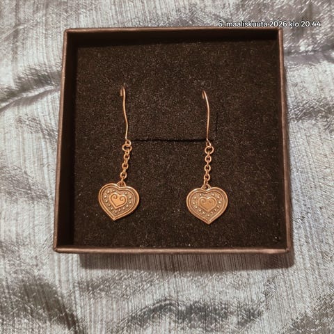 Näitä vain sovitettu, ei varsinaisessa käytössä olleet lainkaan. Sovittaessa korvaani huomasin heti uutena, että koukku on huonosti kiinnitetty ja sen koruliikkeen kautta, josta nämä oli ostettu, koru kävi korjattavana tehtaalla. Tuon korjatun korun koko koukkuosa on hieman pitempi kuin toisessa. Korvassa se ei erotu, koska jäävät samalle korkeudelle.