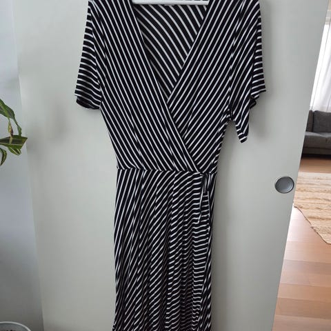 Kaunis musta mekko fuxialla kukkakuviolla.