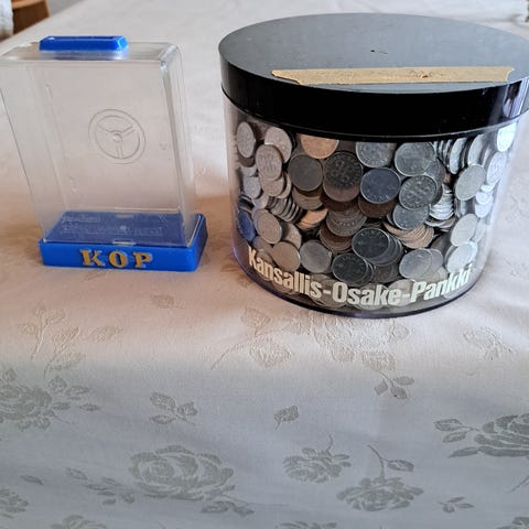 Erilaisia säästöpossuja, säästölippaita. Maapallo säästölipas. Osassa kolikoita luultavasti Markka-ajan kolikoita. Hinta 10e/kpl