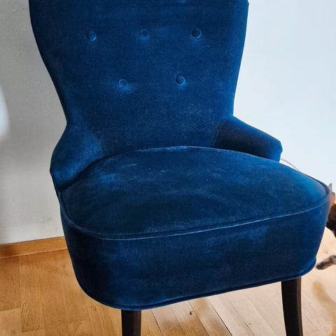 Samettimainen verhoilu, kromijalat. Kevyt, silti tukeva, hyvä istua!