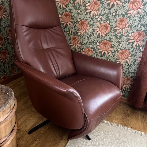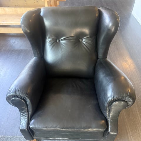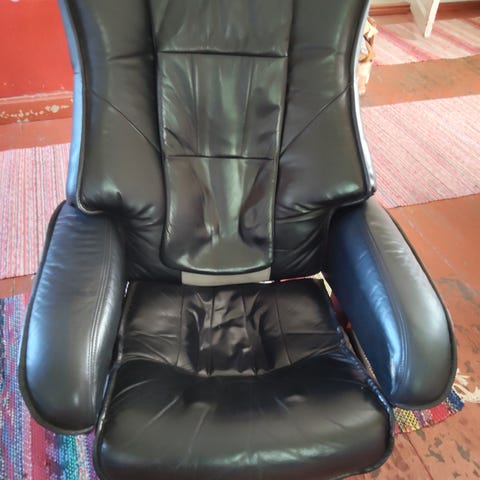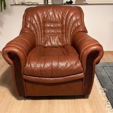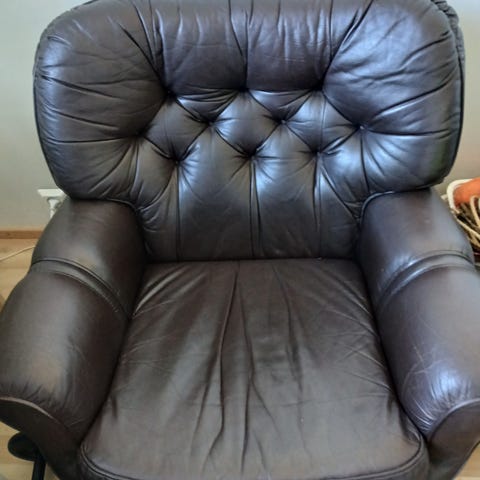 Toimiva nojatuoli, toimivalla mekanismilla.Kangas keinonahkainen, mokkanahka jäljitelmää. Täysin ehjä mutta vaatii puhdistamista.
