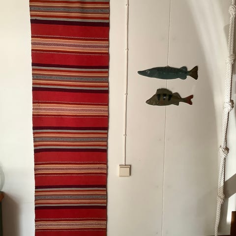 Itse kangaspuilla kudottu raanu, Pirkanmaan kotityön laadukkaista villalangoista, "Aamurusko", hyväkuntoinen. tupakoimattomasta ja ei lemmikkieläimiä omistavasta kodista, puhdas ja kaunis, etsii nyt uutta kotia. Koko 85x147cm, pidike ei sisälly kauppaan (pienen puisen leppäkertun, Ålannin muiston, saa mukaan halutessaan raanun mukana:) Nouto ja käteismaksu tai lähetyskulut 14euroa