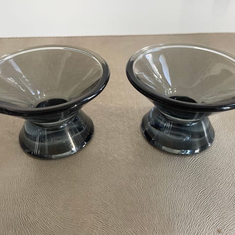 Design Kaj Franck. Tarjolla 1 kpl tummansininen ja 1 kpl turkoosi kynttilänjalka, jotka ovat oikein hyväkuntoisia ja täysin ehjiä. Niiden korkeus on 50 mm ja suurin leveys 85 mm. Hinta on yhden kynttilänjalan kappalehinta.