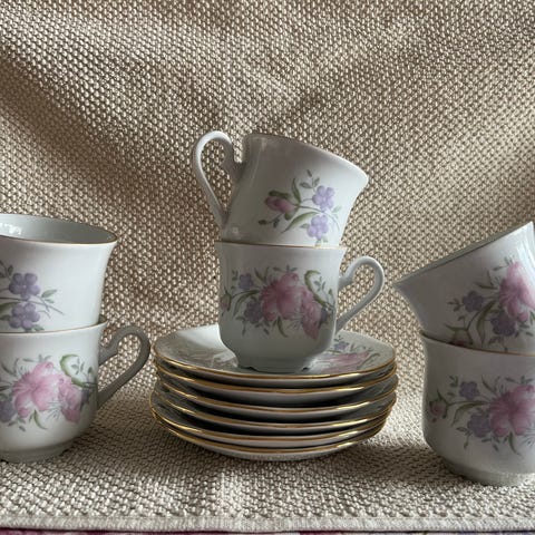Kuvan mukainen kahviastiasto. "Raito" Arabia , 10 kahvikuppia,12 lautasta, 4 pullalautasta, (sokerikko eri sarjaa,käy värin puolesta)