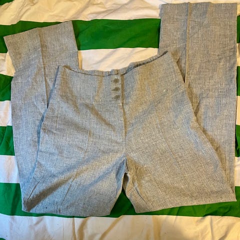 Kesähousut khakinvihreää 100 % pellavaa. Lahkeet ovat leveähköt ja vajaapituiset. Lahkeensuun ulkosivulla pyöristetty halkio.