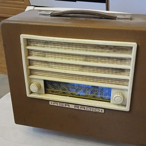 Vintage, keräily,. Patterilla toimiva radio,Transistor 3320, päällinen nahkaa. anteeninnuppi pois, ja normaalia käyttö kulumaa. Katso kuvat, toimi kyllä viimeksi. nyt patterit pois. mitat n. 27 cm x 18 cm x 9 cm + nupit päädyissä ja kahva. Ikäisekseen kunto erinomainen. Harvinainen, olisiko 1960 luvulta, ei ole monta ollut myynnissä. tässä olis vähän räpläämistä harrastajalle. Hinta noudettuna. voin lähettää matkahuollon kautta. +lähetyskulut 10€