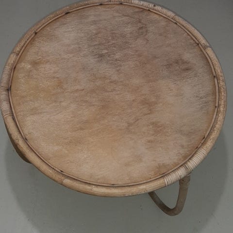 Kaunis täyspuinen pyöreä pöytä, vintage. Ei heilu eikä keiku. Meillä ollut sivupöytänä, kukkapöytänä ja kahvipöytänä. Kunto näkyy kuvissa: vain kannessa on selkeästi näkyviä, vaikkakin suht pieniä elämänjälkiä.
