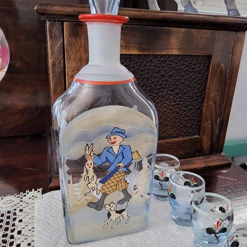 Haku jänis pupu metsästäjäpullo karahvi riihimäen lasi iittala riihimäki vanha vintage 30-luku design käsin maalattu harvinainen metsästäjälle metsästäjän karahvi karahvi metsästäjä metsästäjän metsästäjänkarahvi metsästäjänpullo