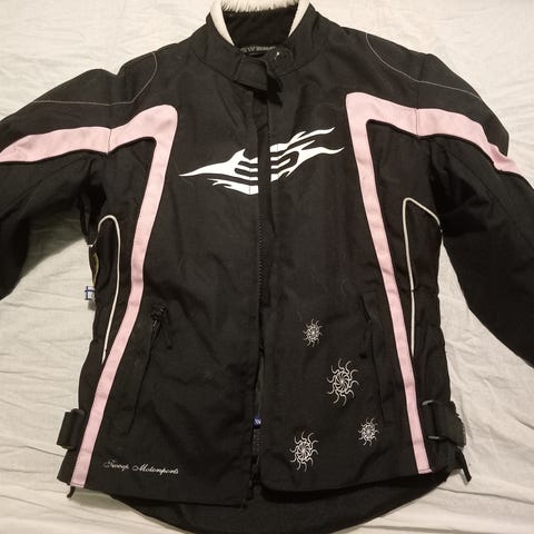 Musta ajotakki pinkeillä kirjailuilla ja niittikoristeilla. Käytetty vain muutamia kertoja.