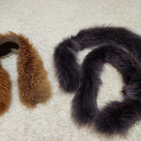 Turkiskauluksia neljä erilaista. Isommat kaksi valmiiksi ommeltuja kiinnikkeineen. Voin ottaa kiinnostuneille vielä tarkempia kuvia.