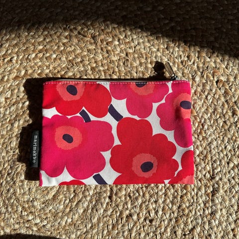Marimekon Unikkokuosinen laukku ja punaisen sävyinen pussukka. Hinta sis. postikulut
