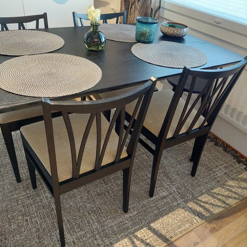 Kunnostetut vintage tuolit x 4kpl, istuinosan päällinen Alcantara nahkaa. Tuolin rungon väri ruskea.