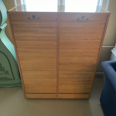Myytävänä pankin toimistokalusteita, rulolaatikosto