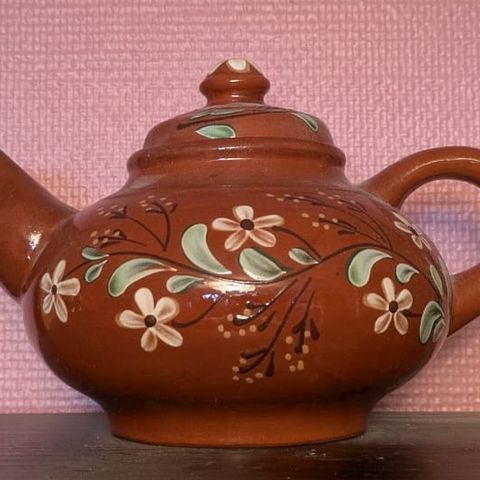 Keraaminen teekannu kukkakuviolla. Täysin ehjä ja virheetön. Uusi, käyttämätön. Käsinmaalattu kuviointi. Korkeus 15 cm. Leveys 17,5 cm.