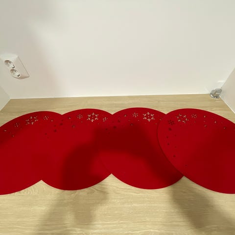 Seitsemän kaunista pöytätablettia,, punaisia voi käyttää myös pieninä pöytäliinoina jouluna..