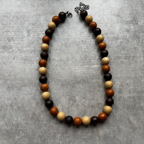 Värikkäät puuhelmet kaulaan ripustettavaksi.